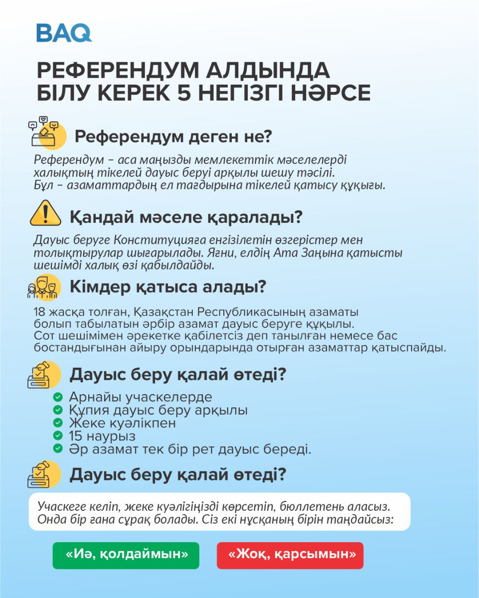 САЯСАТ РЕФЕРЕНДУМ: ӘР АДАМ БІЛУІ ТИІС 5 НӘРСЕ От Meirim Qogam - 23.02.2026 0 177 FacebookTwitterPinterestWhatsApp 2026 жылғы 15 наурызда Қазақстанда жаңа Конституция жобасына дауыс беру үшін республикалық референдум өтеді. Ел азаматтары өз таңдауларын жасай отырып, елдің құқықтық және саяси дамуына тікелей ықпал ету мүмкіндігіне ие болады. Post Views: 187